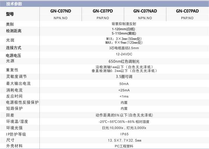 ECOTTER GN-C07系列 背景抑制小型光電開關新品上市,這款光電開關厚度只有7毫米,節(jié)約安裝空間,功能強大,具有背景抑制效果,感應黑白距離差值比較小,可見光方便對位安裝,檢測更加精確,滿足普遍的工業(yè)自動化控制應用。