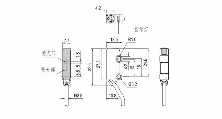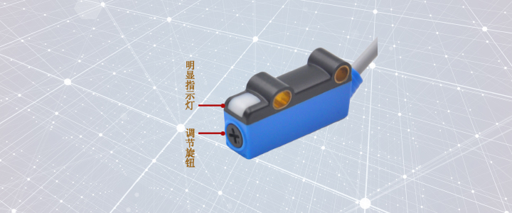 傳感器帶十字調(diào)節(jié)旋鈕,調(diào)整檢測距離,3.5圈可調(diào),帶明顯指示燈,上電時顯示紅色,有輸出綠燈亮起。