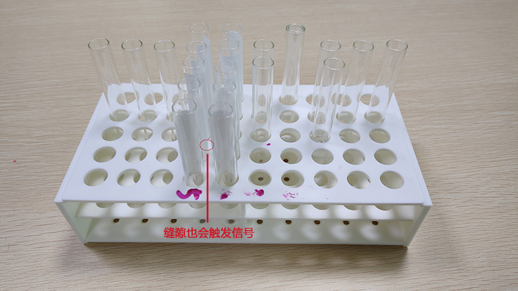 光學(xué)傳感器由于感應(yīng)原理的問題,時而會遇到檢測環(huán)境復(fù)雜,影響檢測的情況。我們最近遇到醫(yī)療設(shè)備客戶需要檢測座架上的試管,每一排位置的有試管都需要給出信號,結(jié)果發(fā)現(xiàn)沒有背景的情況下,當(dāng)試管排布得比較多的兩排,背景抑制光電開關(guān)檢測縫隙時也會輸出信號,信號無法正常斷開。