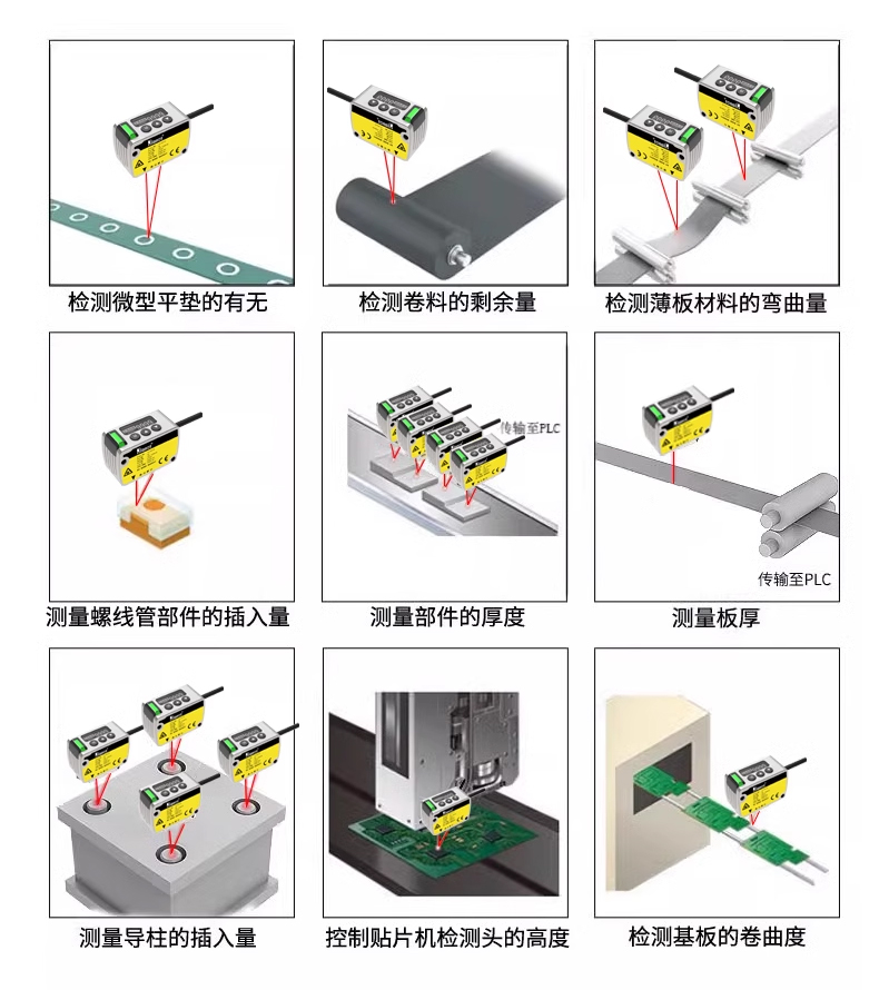 激光位移傳感器是新型測(cè)量?jī)x表,能夠精確非接觸測(cè)量物體的位置、位移等變化,可以測(cè)量厚度、振動(dòng)、距離、直徑、偏移度、平面落差等,應(yīng)對(duì)大部份工業(yè)自動(dòng)化的探測(cè)需求。