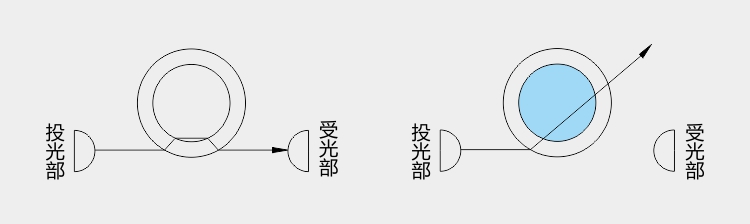 ②如導管內(nèi)有液體,投光部發(fā)出的光將穿透液體,不進入受光元件。(遮光狀態(tài))