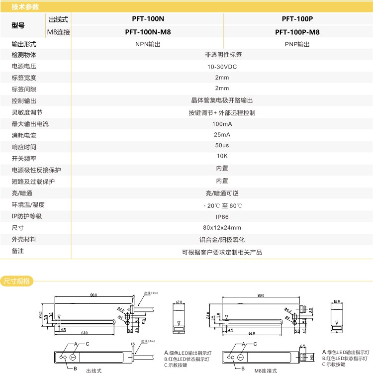 ECOTTER 光電標(biāo)簽傳感器 PFT-100系列 可以高速檢測標(biāo)簽達(dá)10Khz,常開常閉可切換,常開是檢測到標(biāo)簽輸出信號,檢測到間隙停止信號;常閉是檢測到間隙輸出信號,長按設(shè)置鍵8秒切換。
