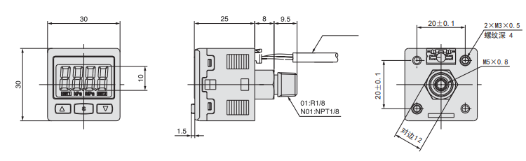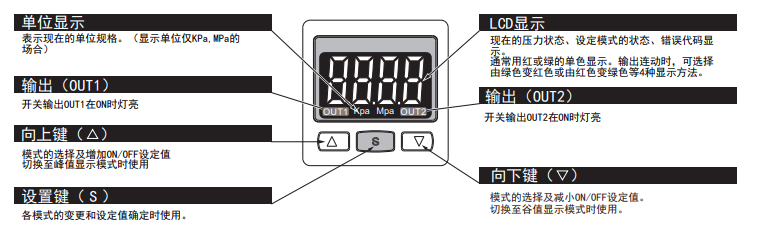 壓力傳感器的外形小巧,正面為LCD顯示和三個(gè)操作按鍵;背面為電源接入口和氣壓接入口。